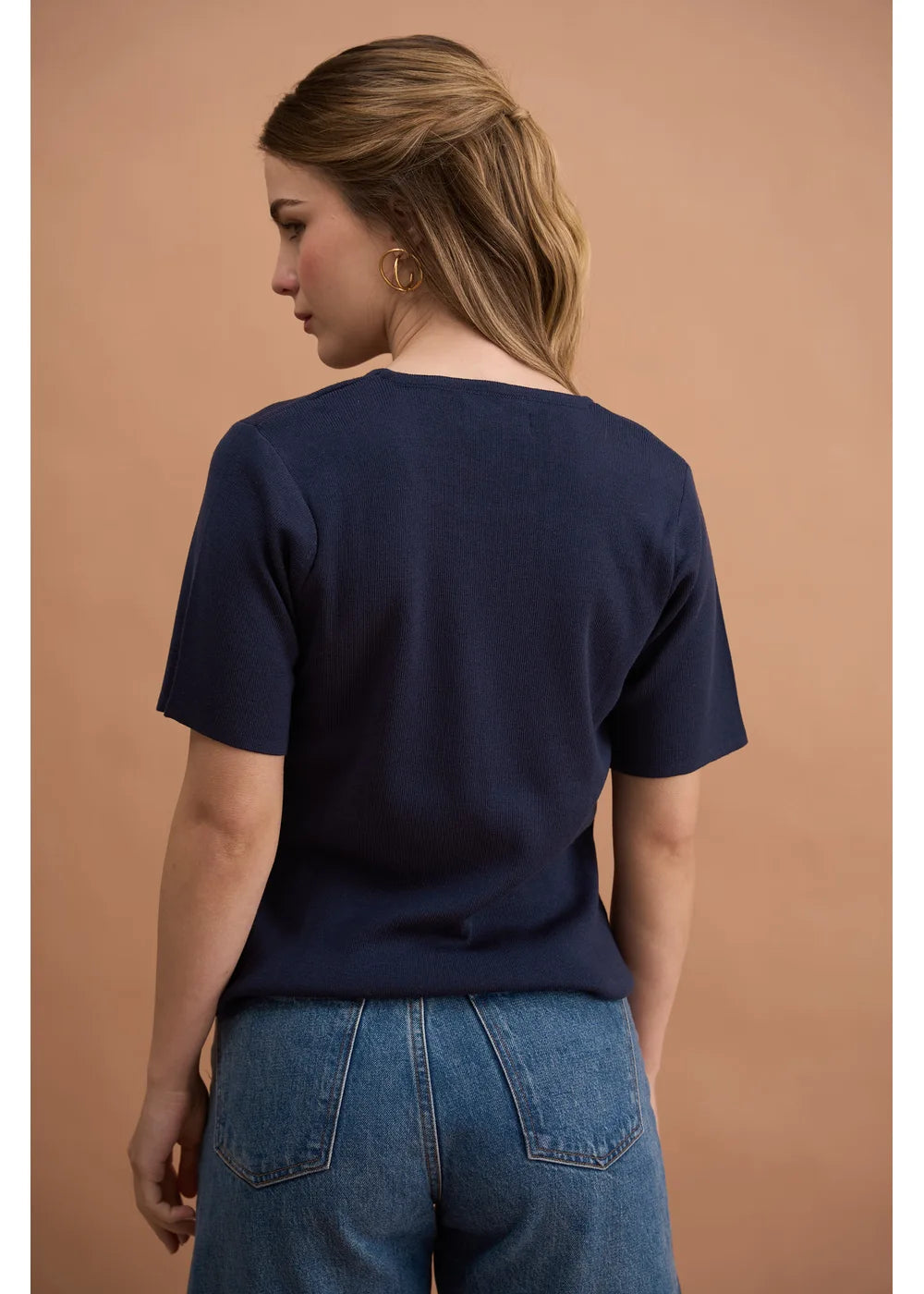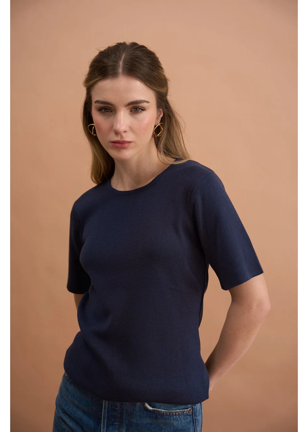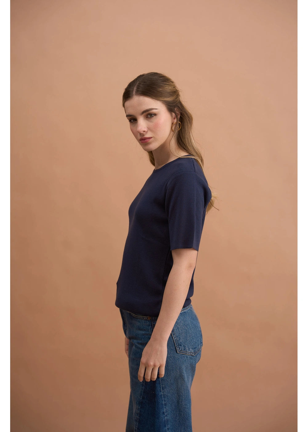 Con cuello redondo y manga corta, esta blusa destaca por su silueta relajada y tejido ligero al tacto.