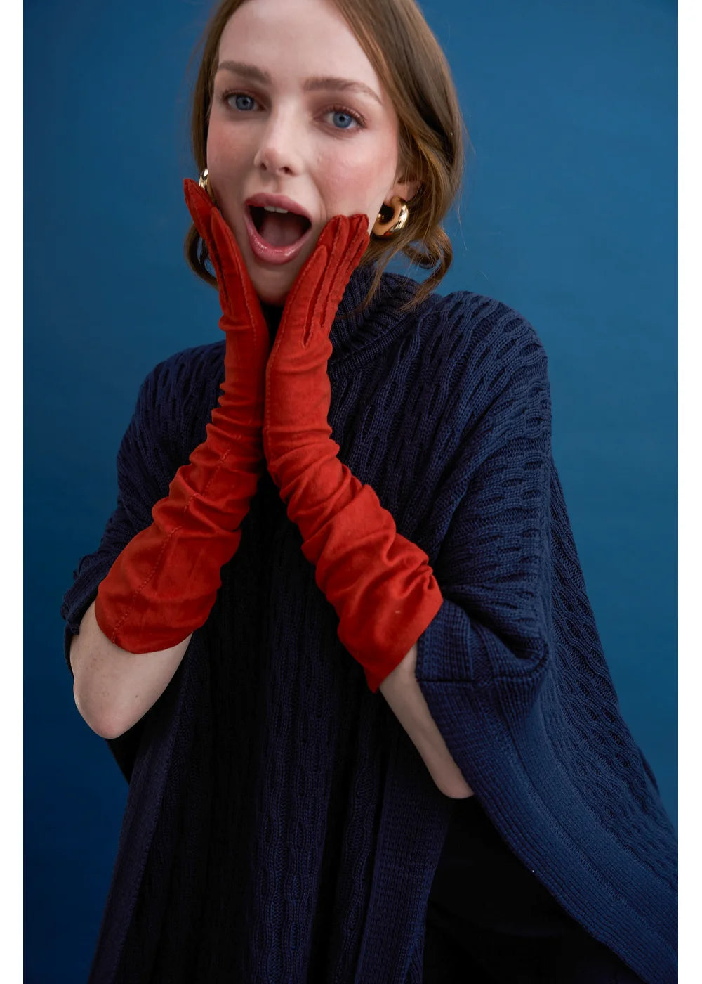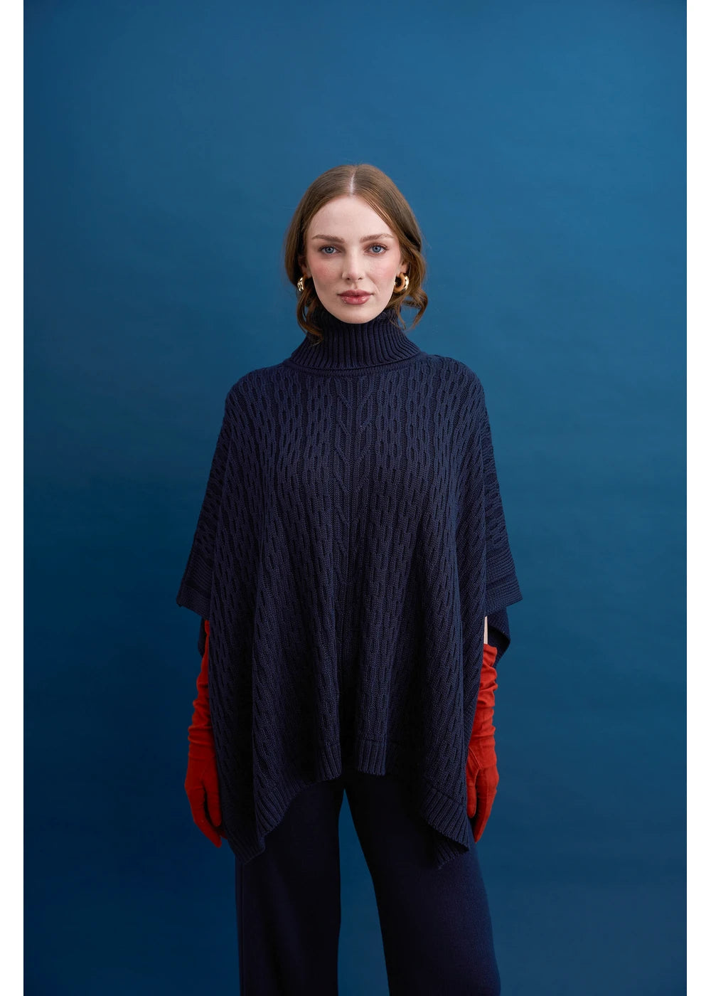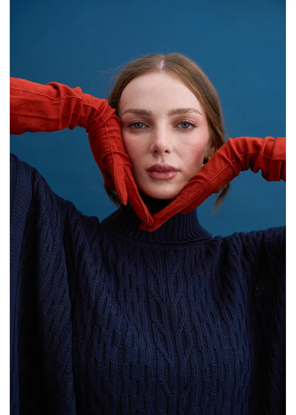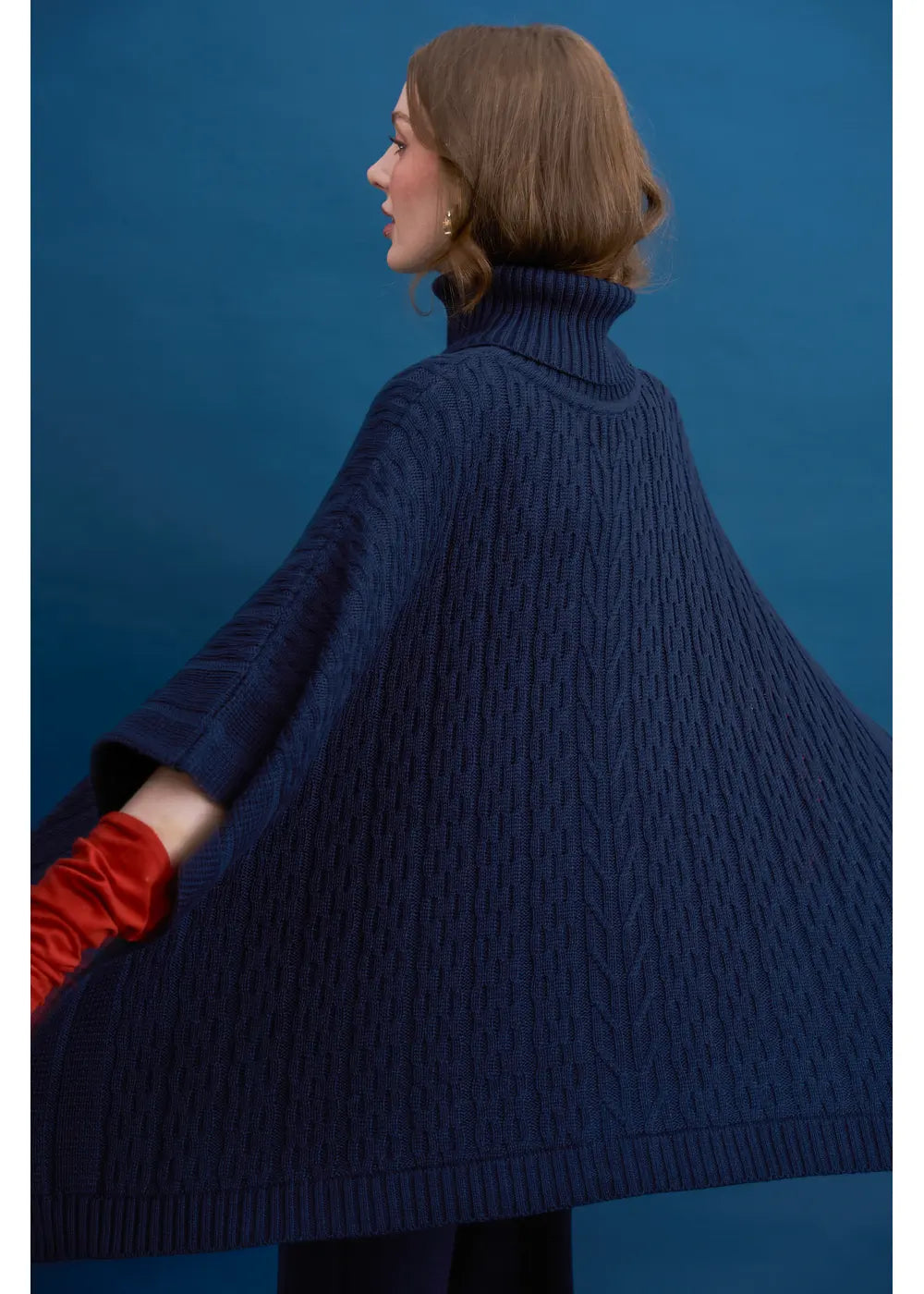 Cuello alto de punto acanalado que aporta calidez y estructura.