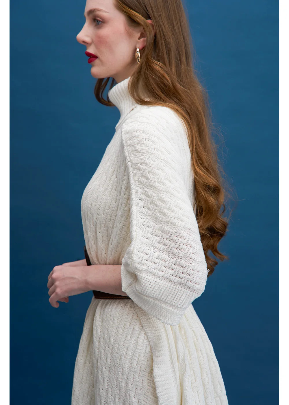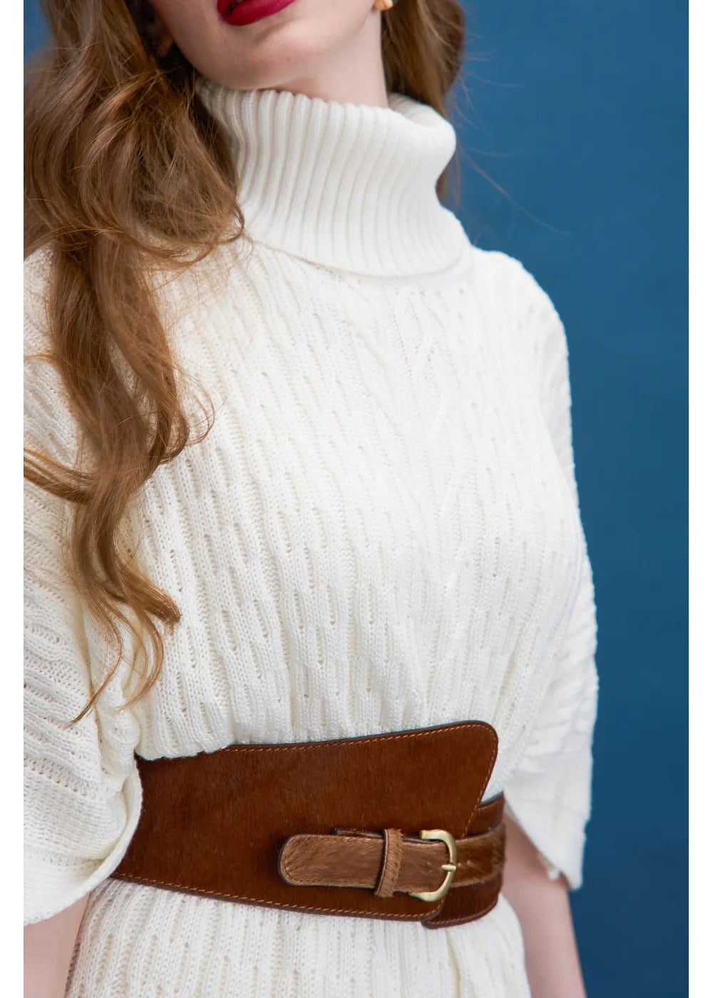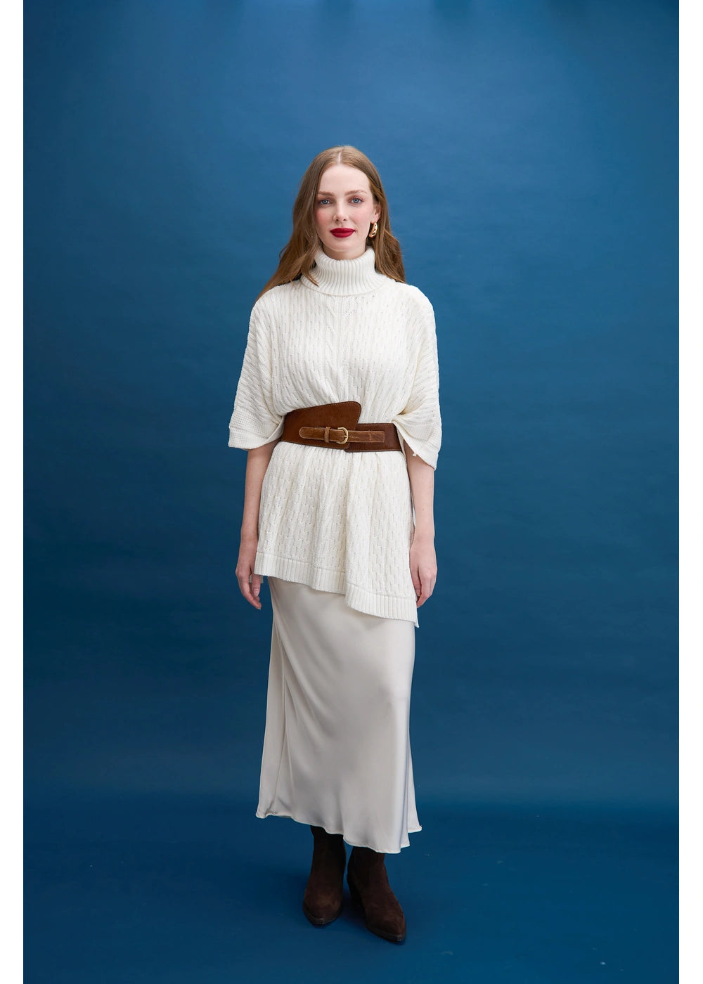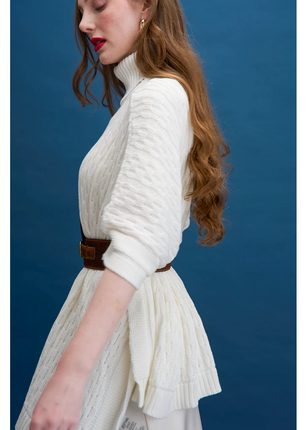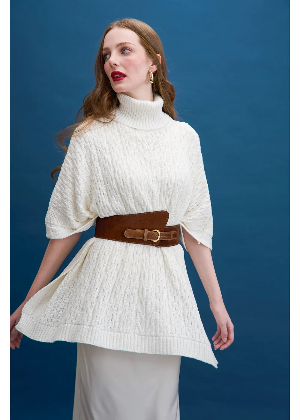 Cuello alto de punto acanalado que aporta calidez y estructura.