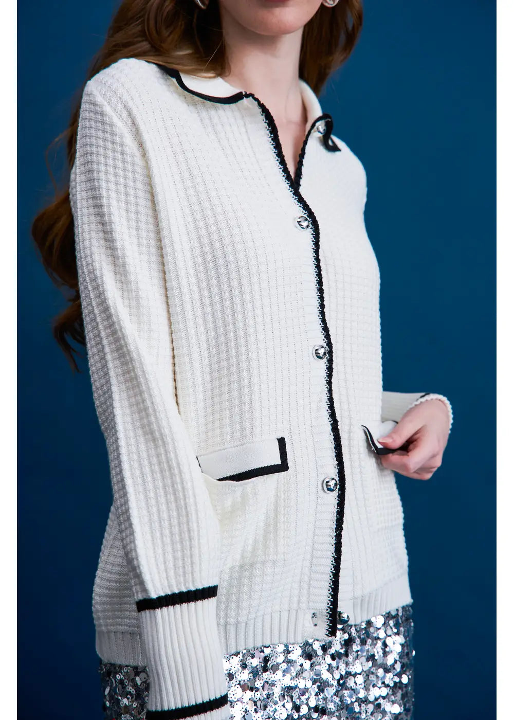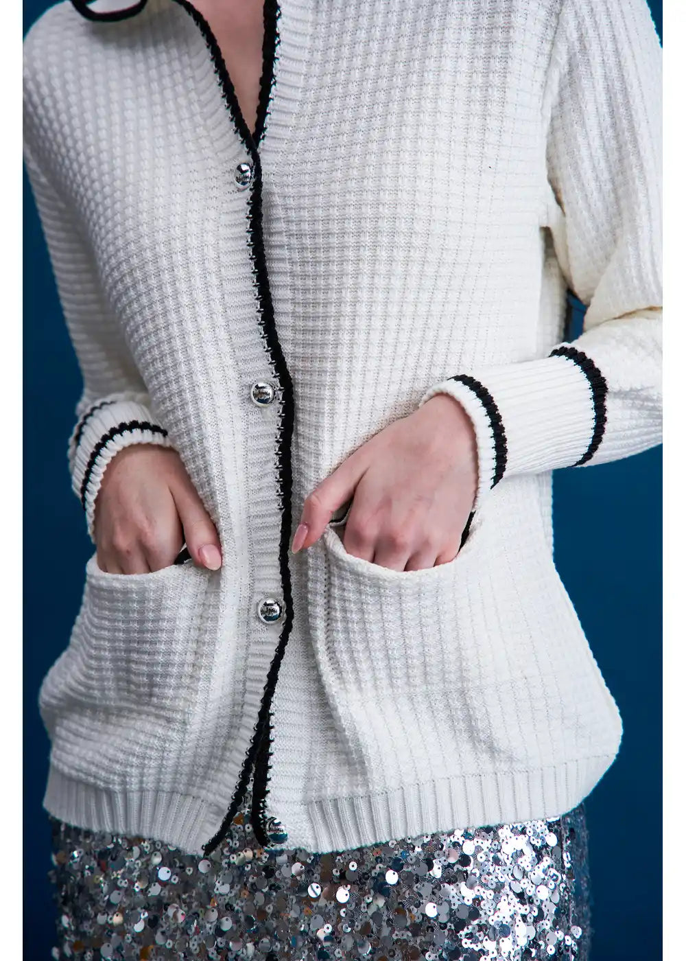 Diseño de punto waffle con ribetes en color contraste en el cuello, la tapeta y los puños.