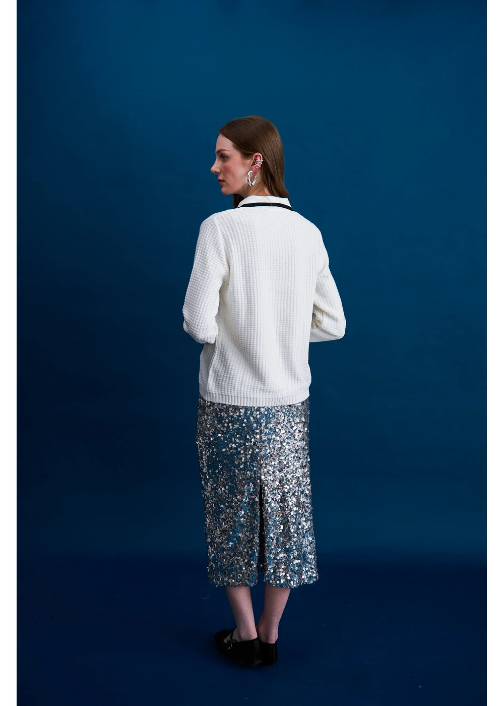 El knit de textura y el contraste bicolor le dan un aire sofisticado y preppy.