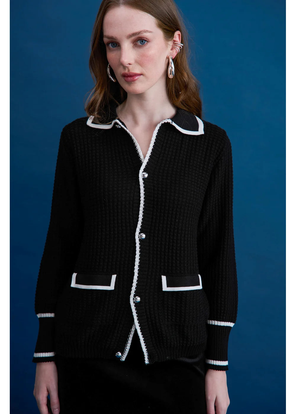 Diseño de punto waffle con ribetes en color contraste en el cuello, la tapeta y los puños.