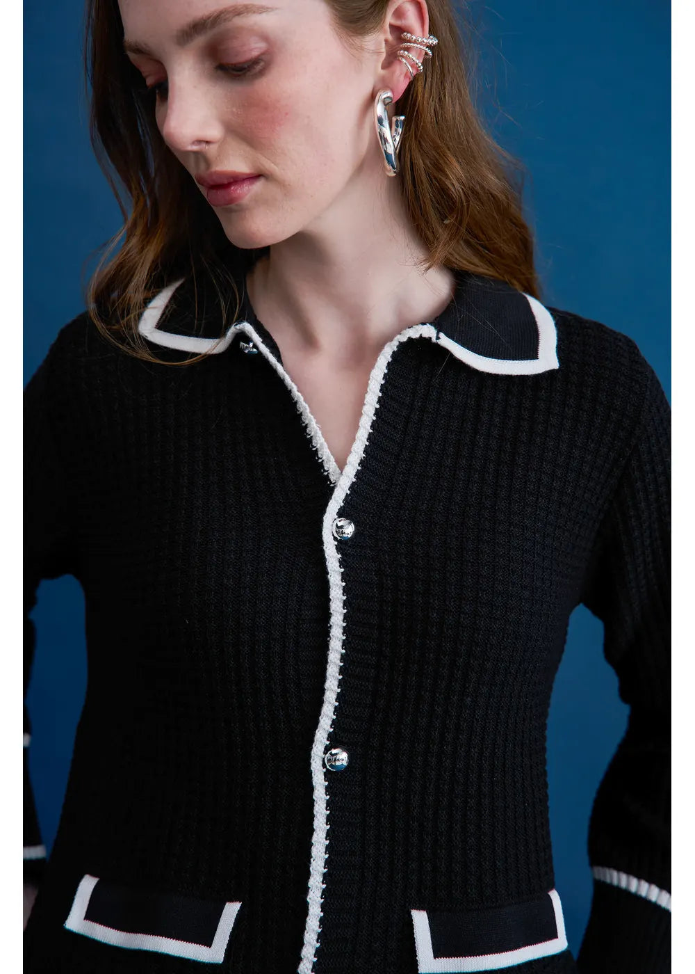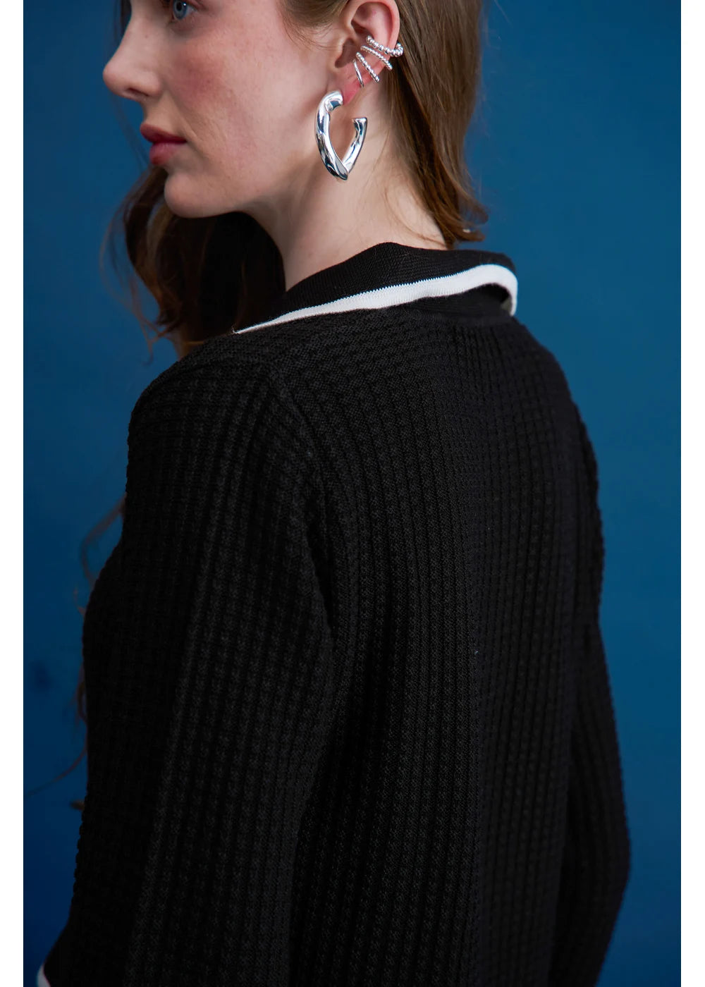 El knit de textura y el contraste bicolor le dan un aire sofisticado y preppy.