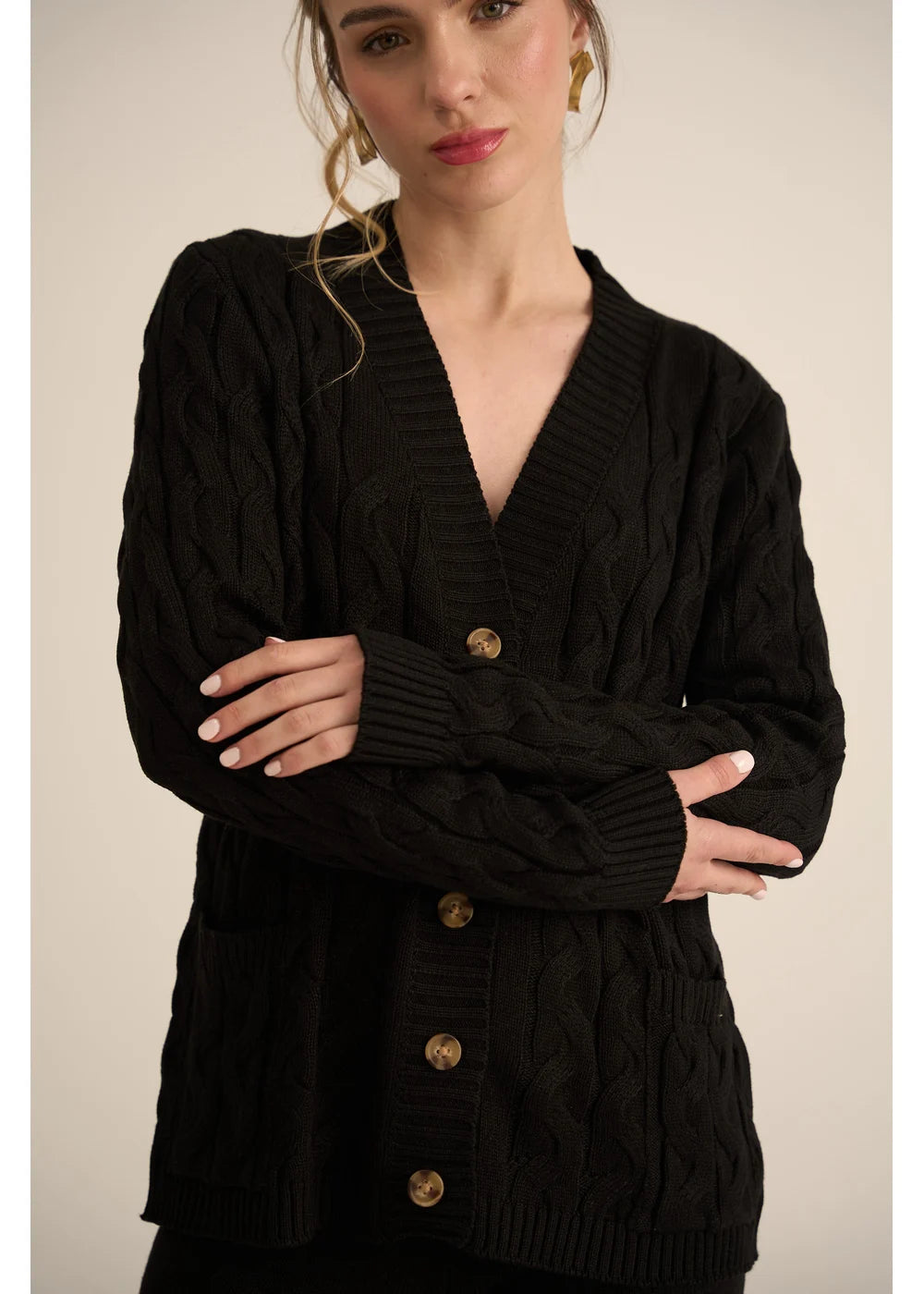 Cárdigan de cuello en V y manga larga. Diseño tejido trenzado, horma recta y acabados en rib. Cierre de abotonadura frontal en efecto carey. En set con nuestro pantalón Celia.