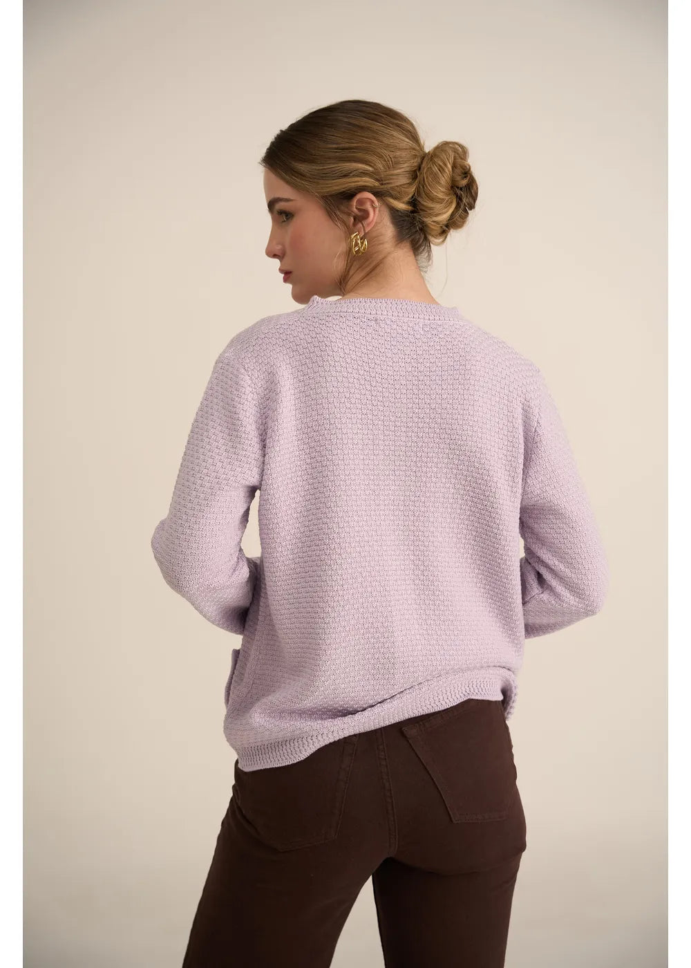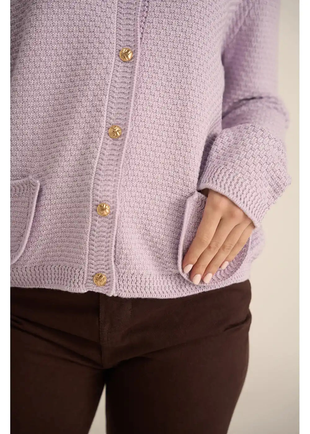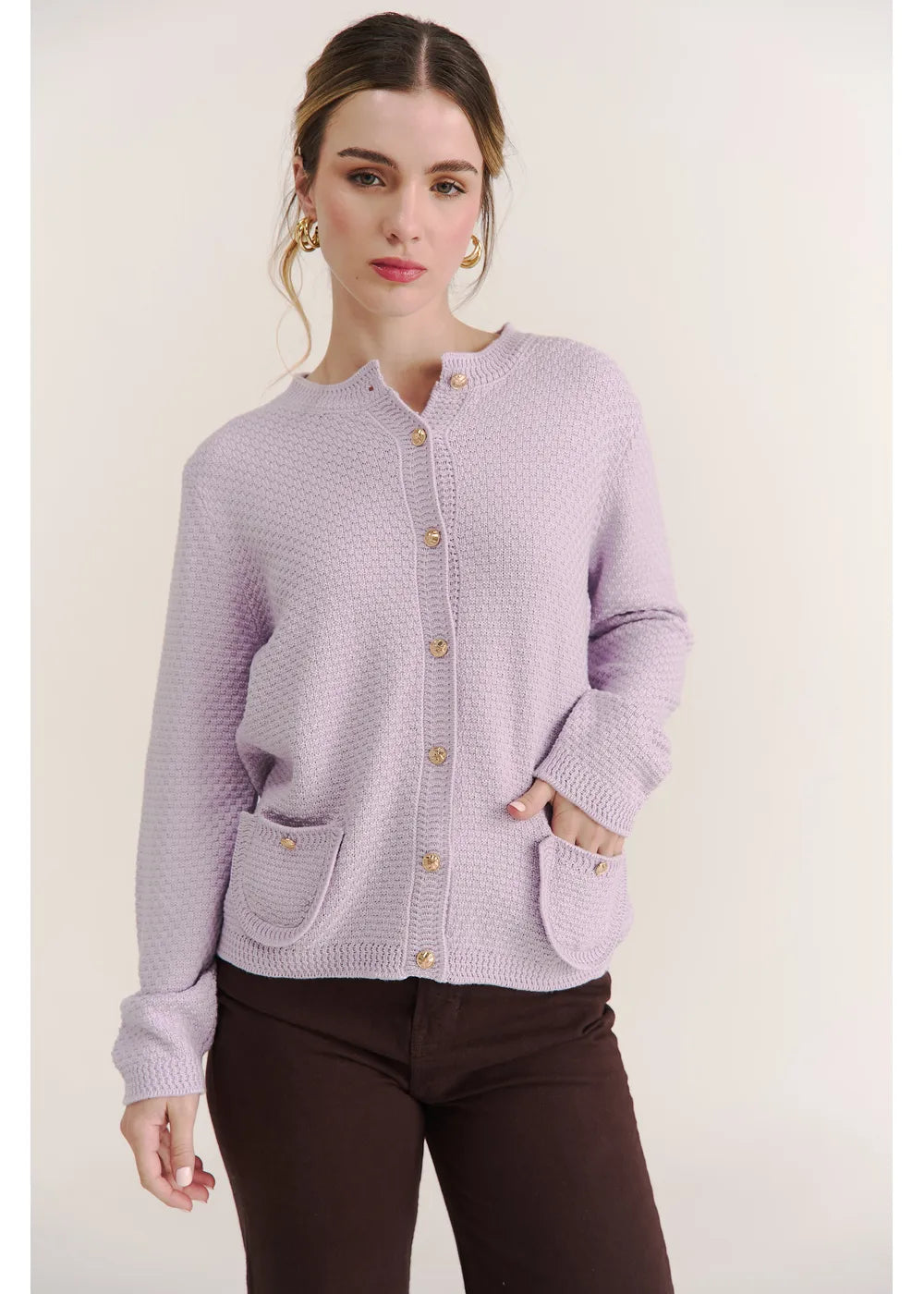 Confeccionado en fibras vegetales, su textura en punto pequeño se complementa con botones dorados y bolsillos frontales.