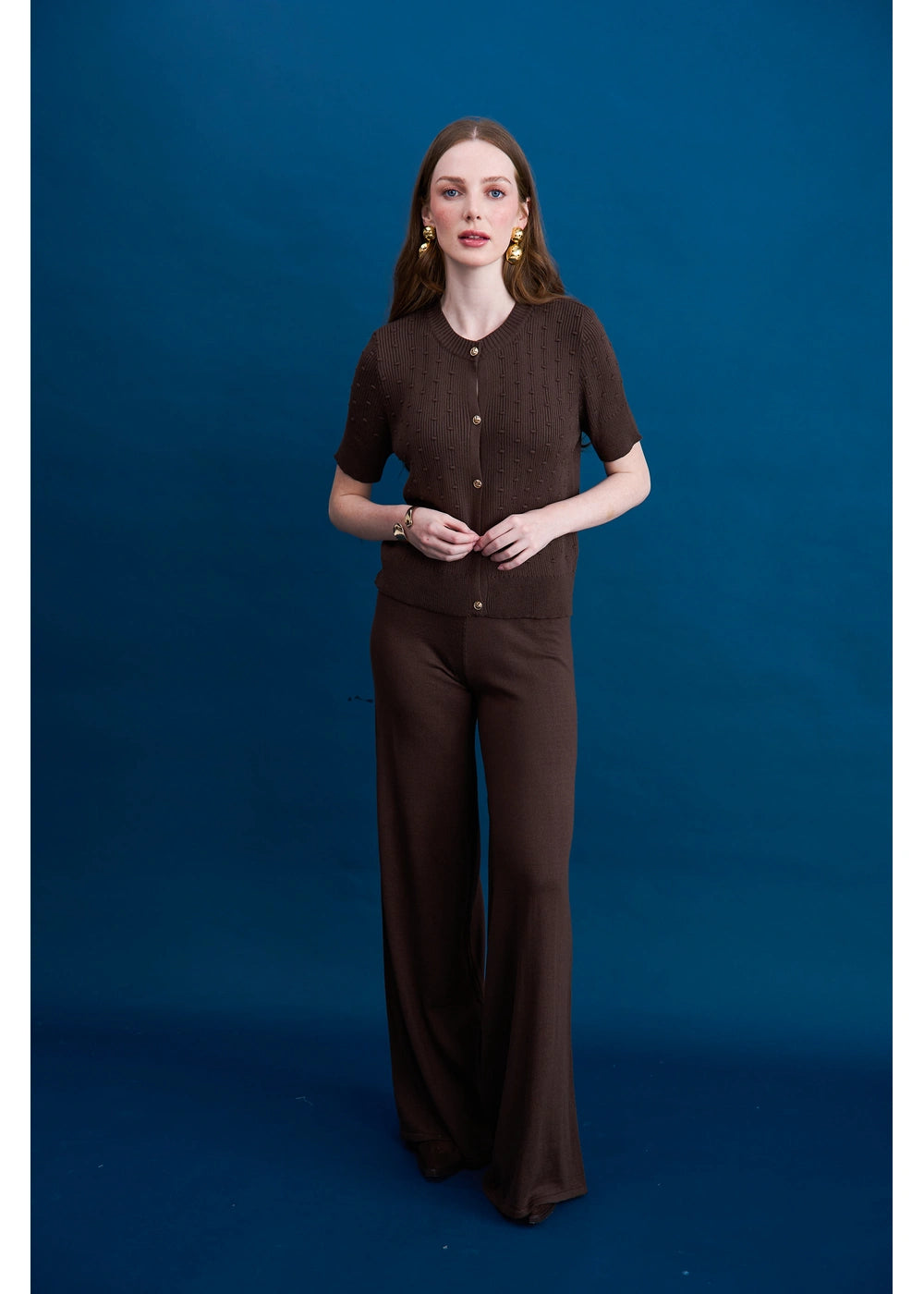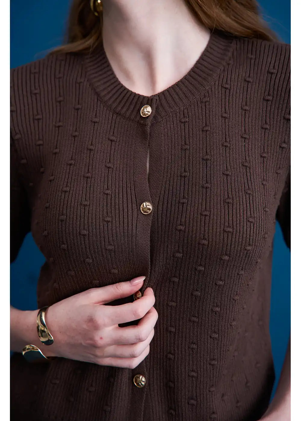Cuello redondo clásico con detalle de trenzado fino y cierre frontal con botones metálicos.