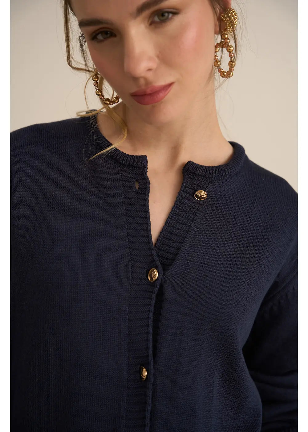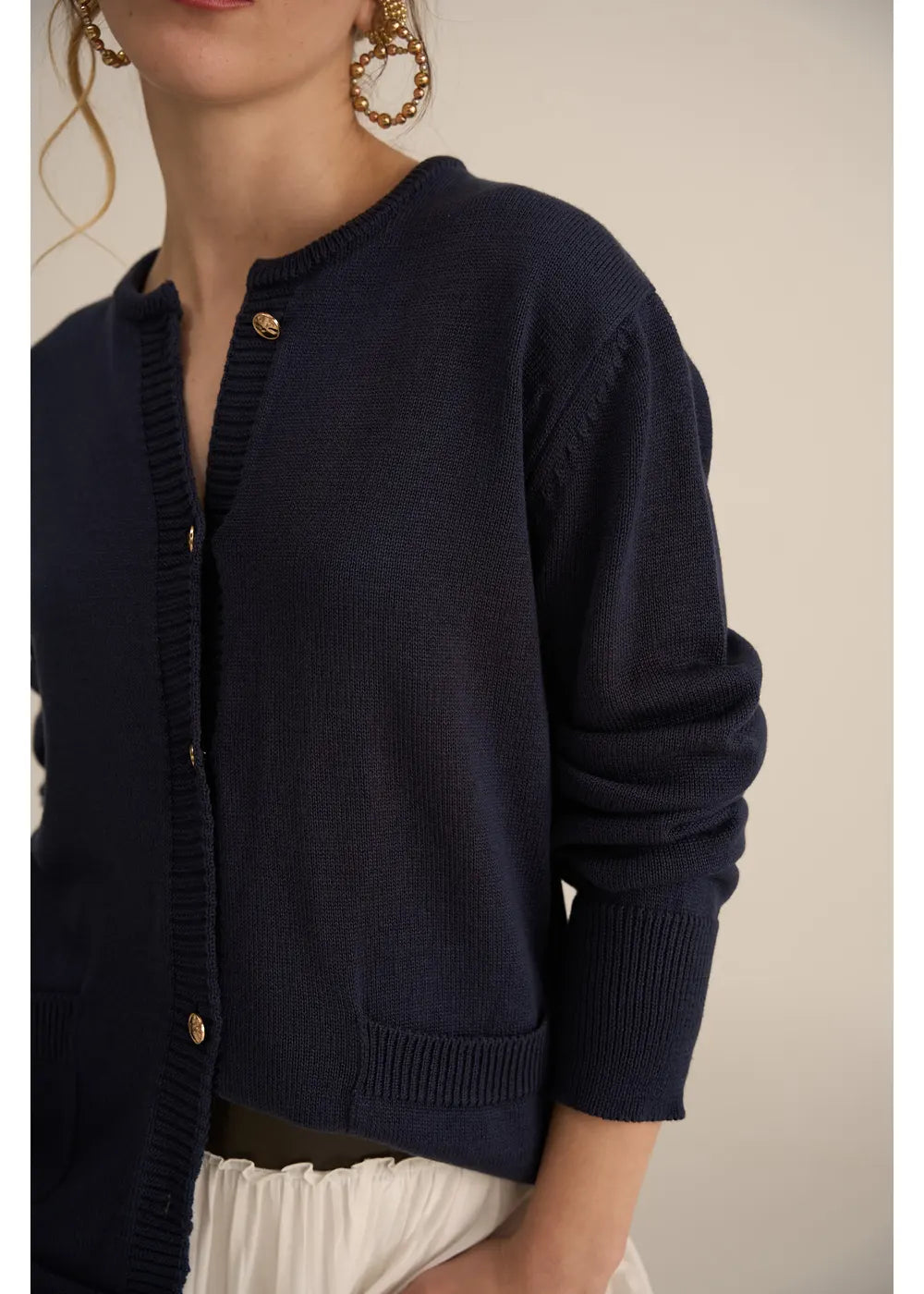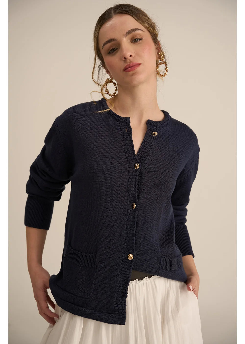 Cuenta con cuello redondo, botones frontales y bolsillos que lo convierten en un básico versátil.