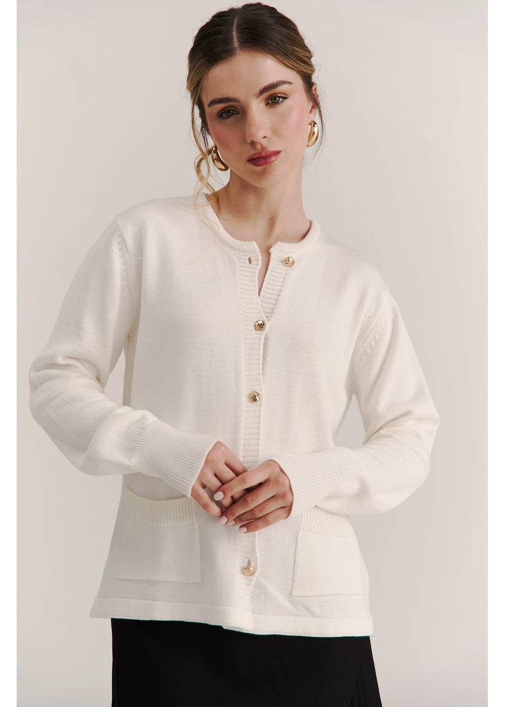 Cuenta con cuello redondo, botones frontales y bolsillos que lo convierten en un básico versátil.