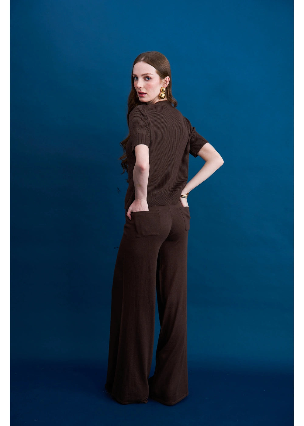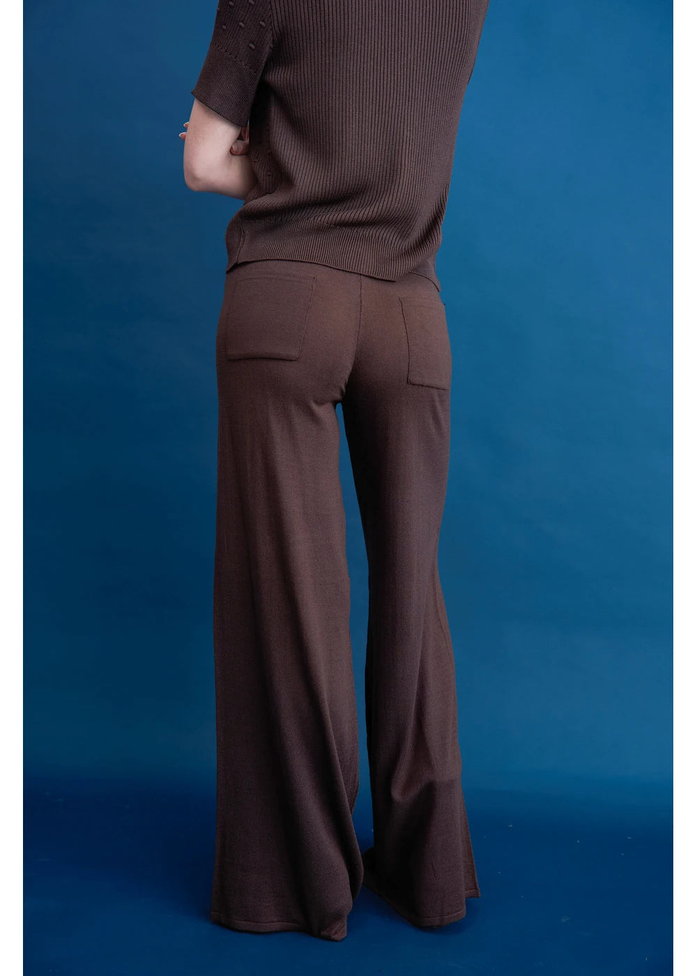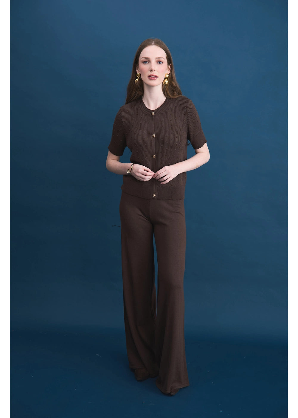 Pantalón de tejido de punto suave con patrón acanalado vertical que estiliza y alarga la figura.