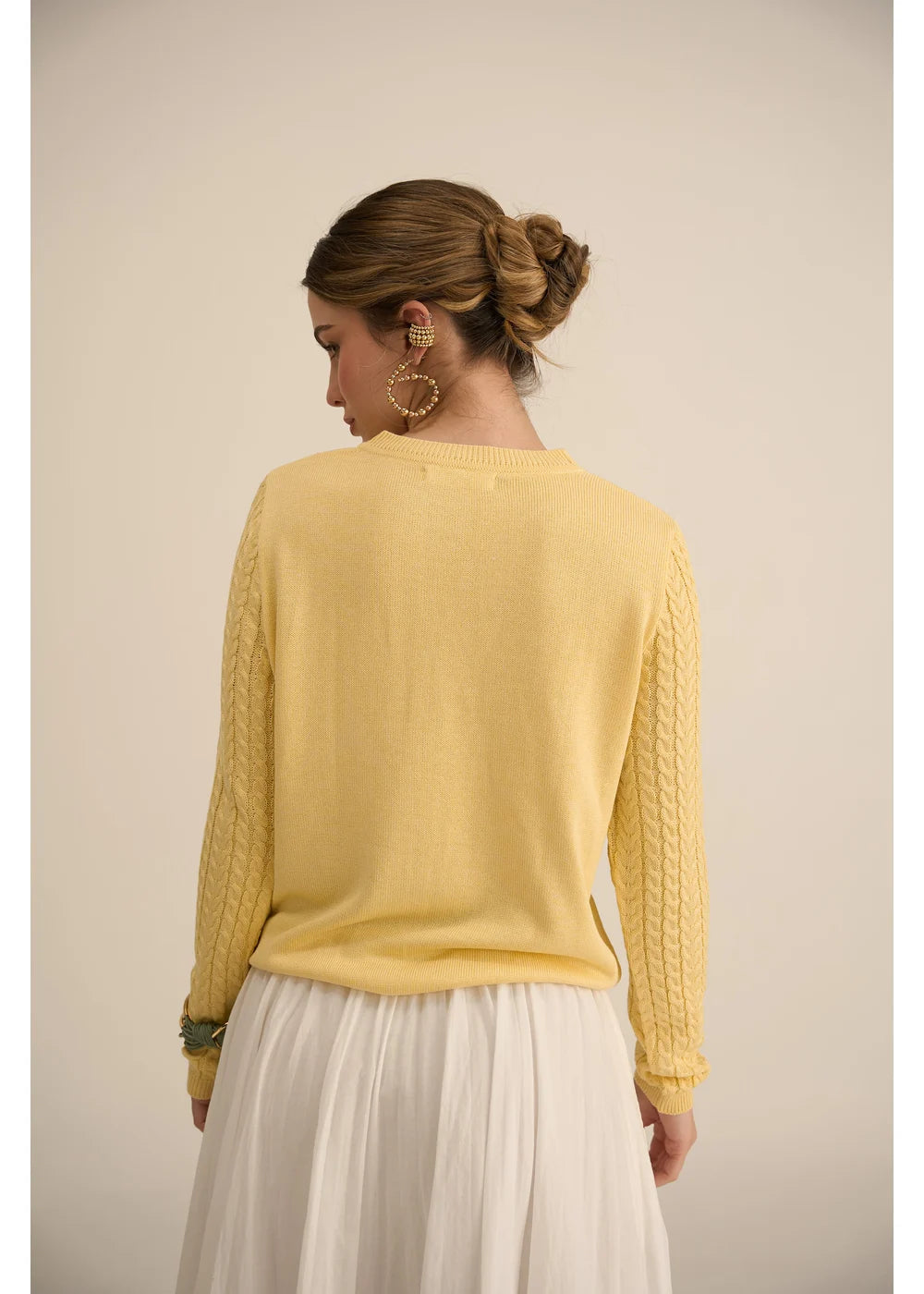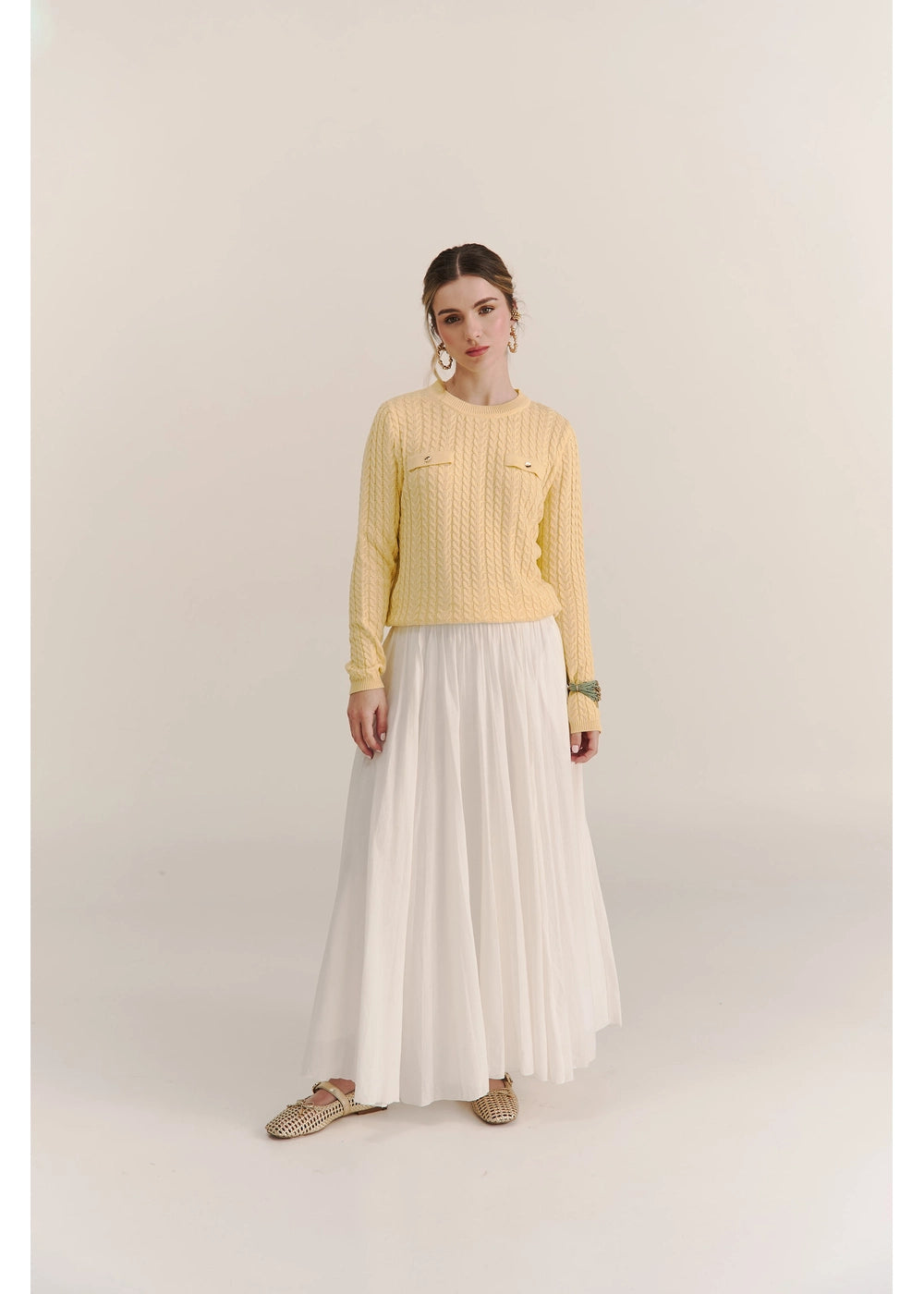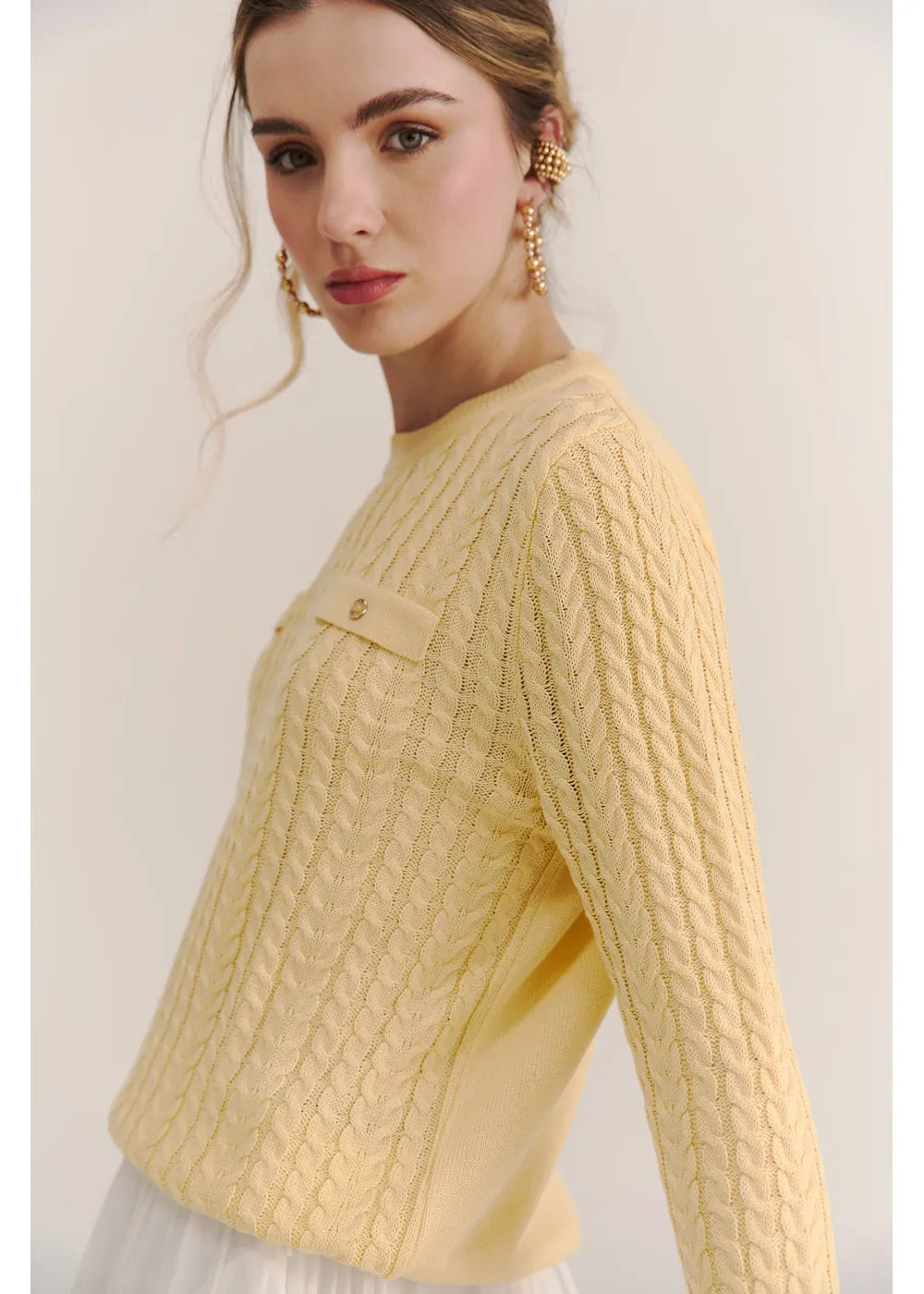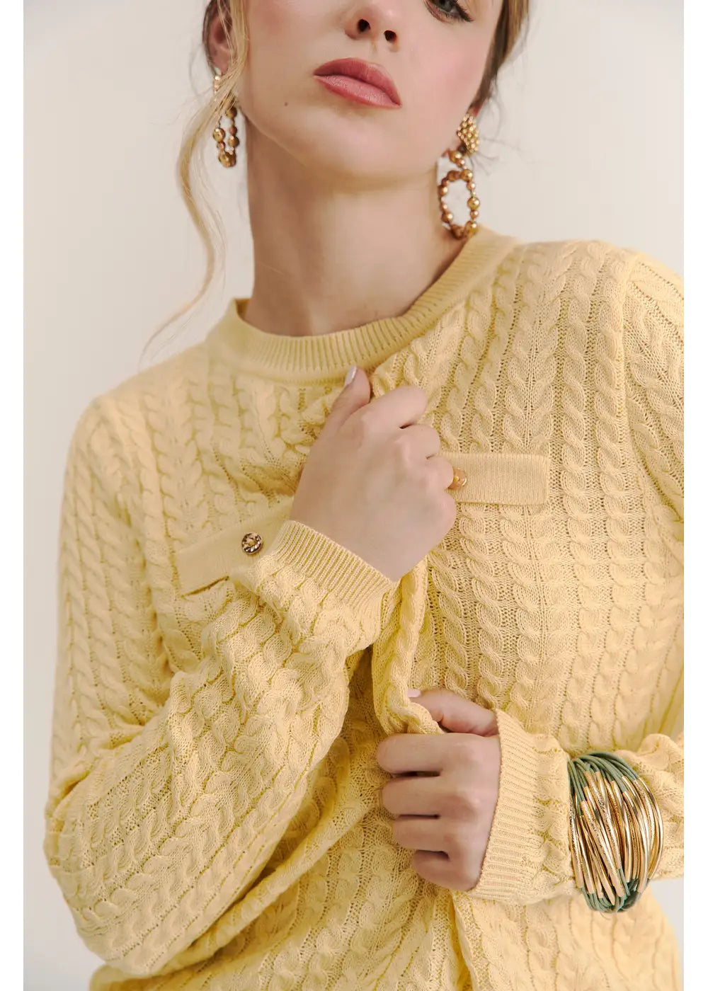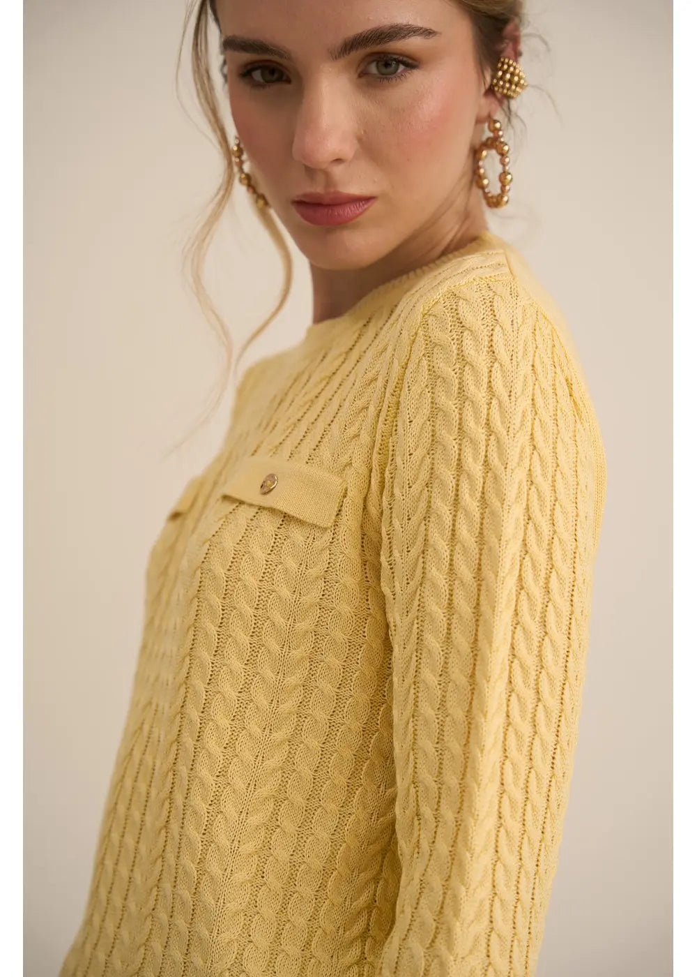 Su diseño de trenzas en relieve se complementa con bolsillos simulados decorados con botones dorados y cuello redondo.