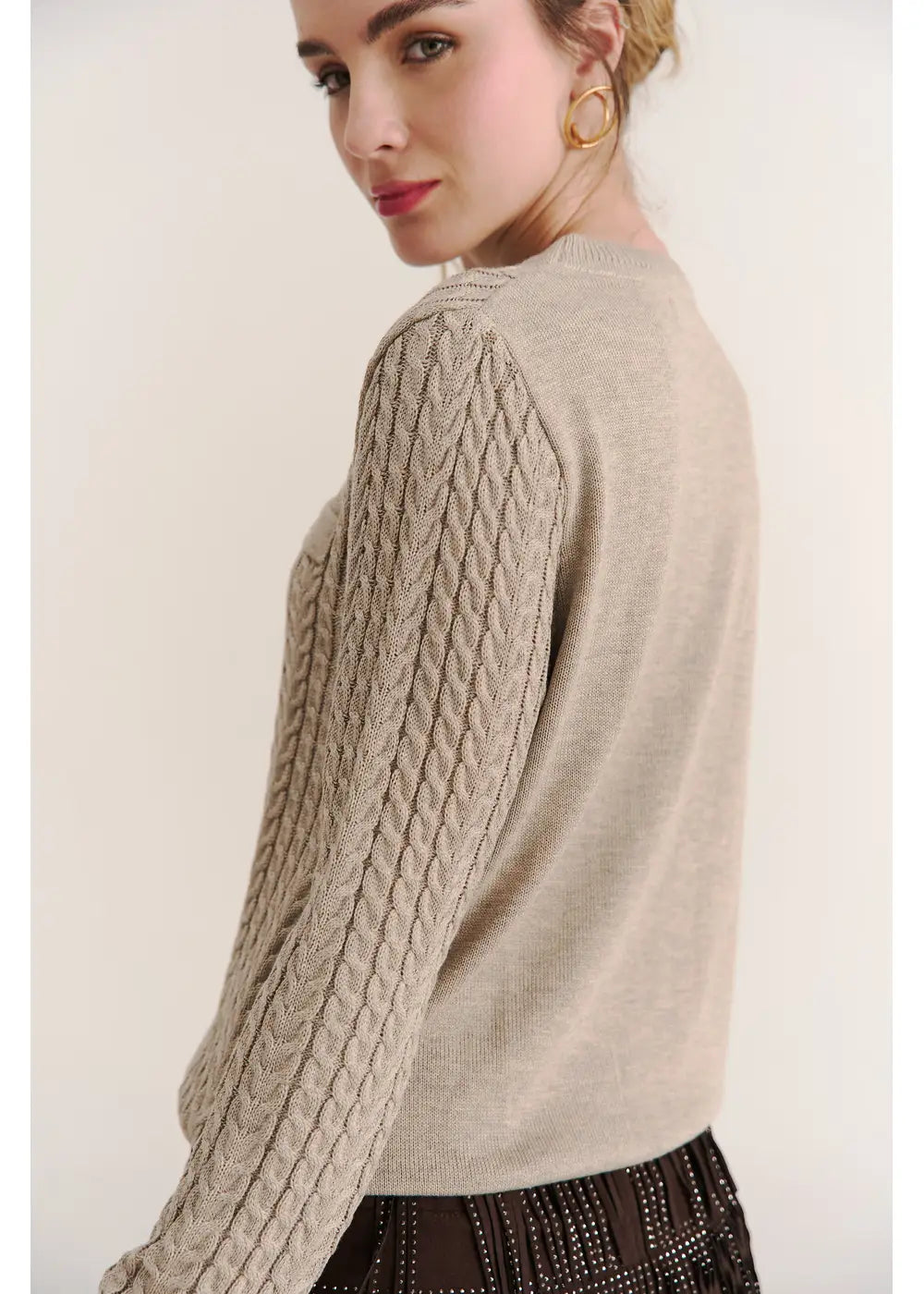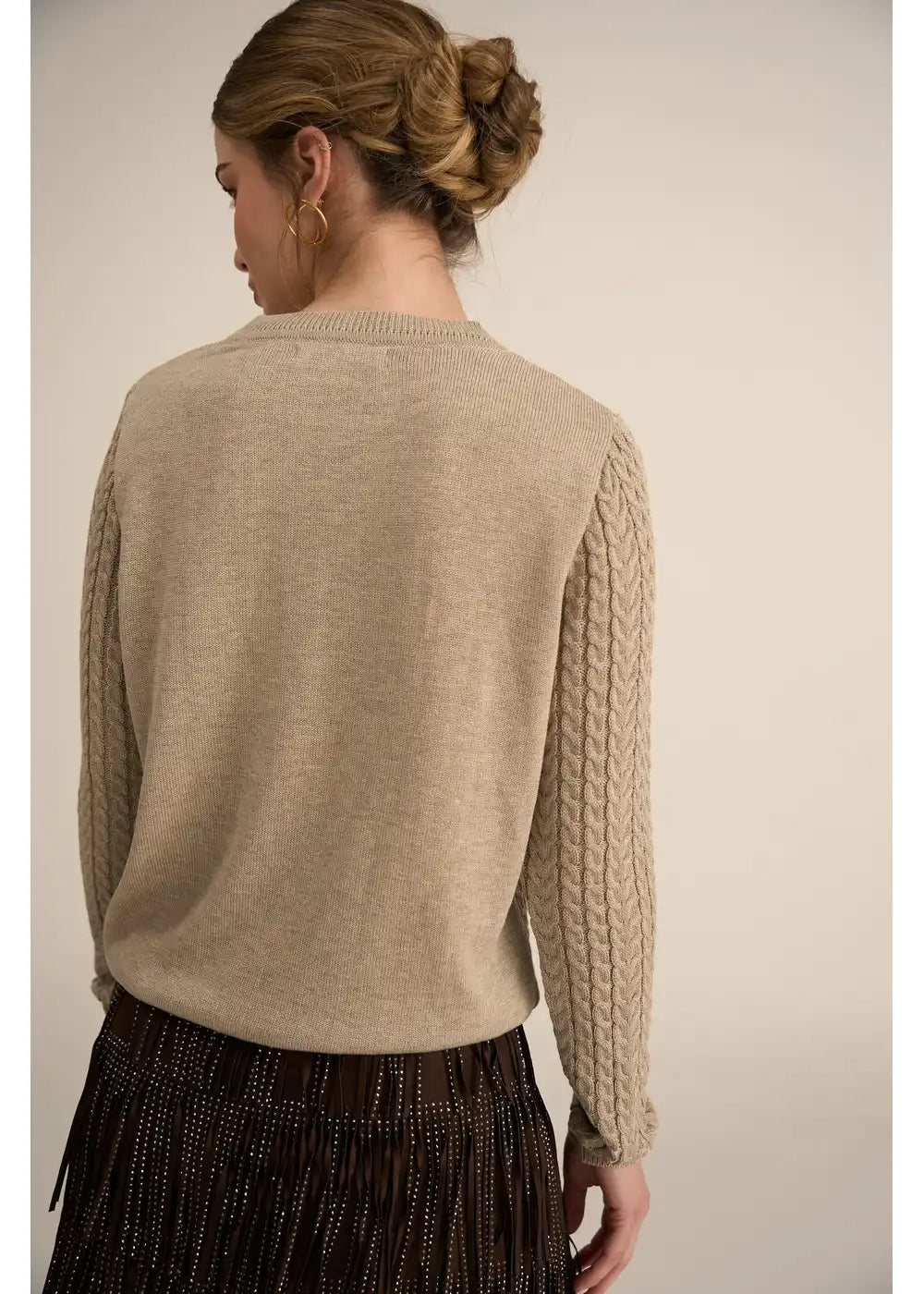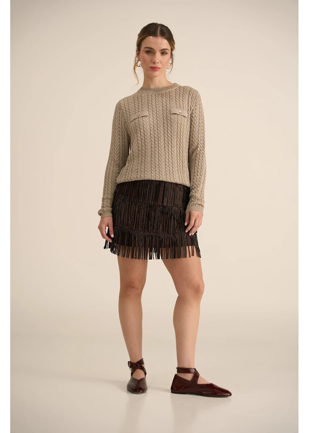 Su diseño de trenzas en relieve se complementa con bolsillos simulados decorados con botones dorados y cuello redondo.