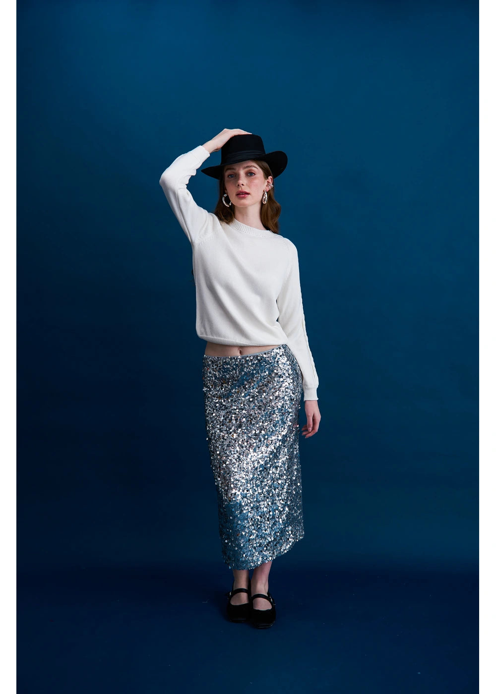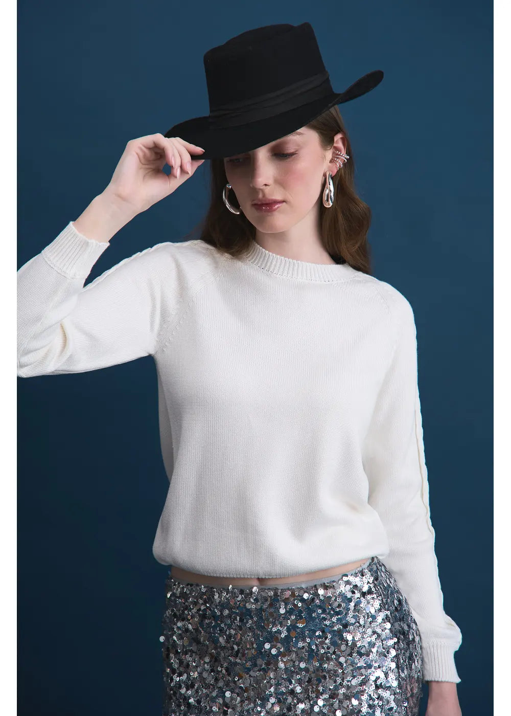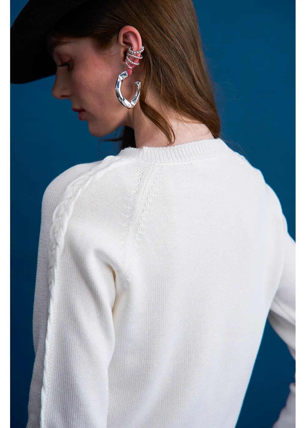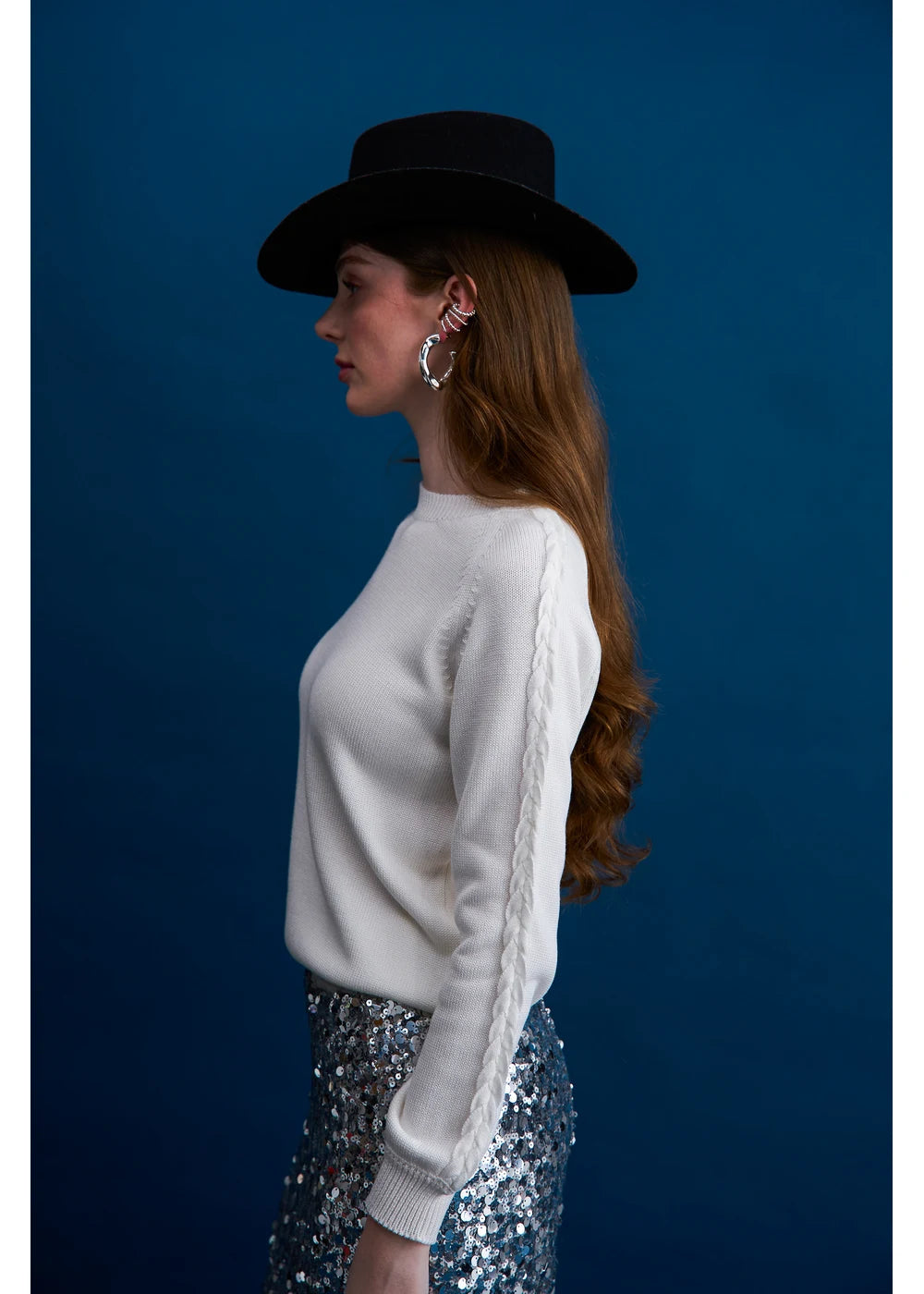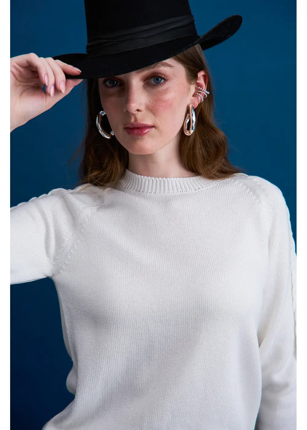 Cuello redondo clásico y sutil detalle trenzado que recorre la costura de las mangas.