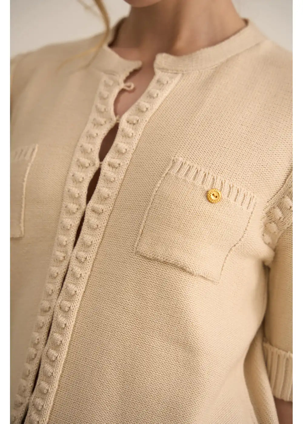 Con bolsillos frontales decorativos y botones dorados, destaca por sus detalles trenzados en hombros y tapeta.