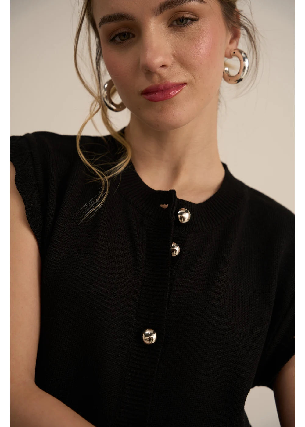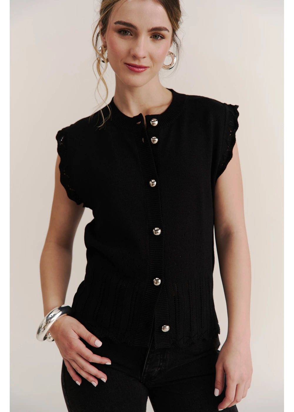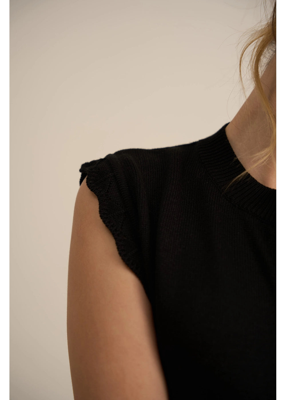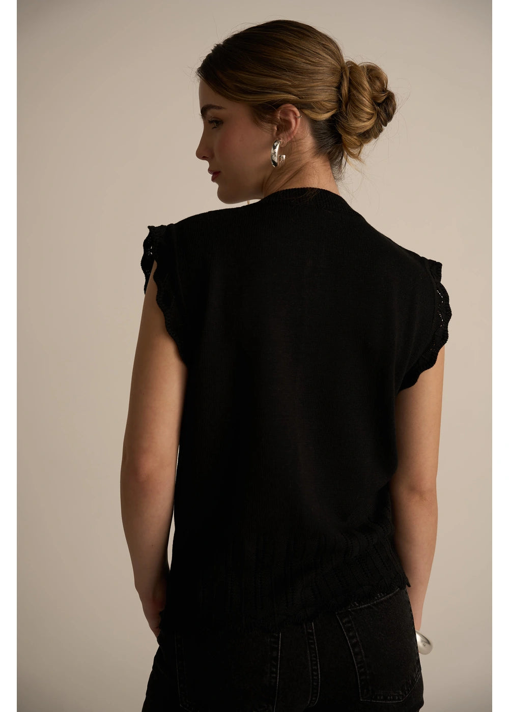 Vest tejido de cuello redondo y manga siza. Diseño tejido en petine, terminaciones onduladas en el ruedo y mangas en patrón trenzado.