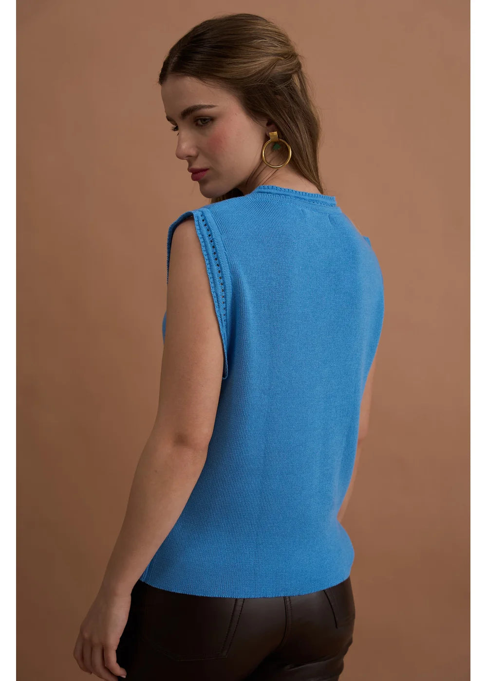 Chaleco tejido sin mangas con silueta recta y ligera, elaborado en fibras vegetales que aportan suavidad y frescura.