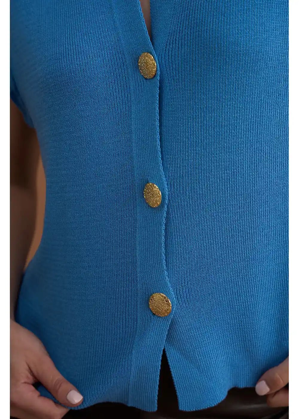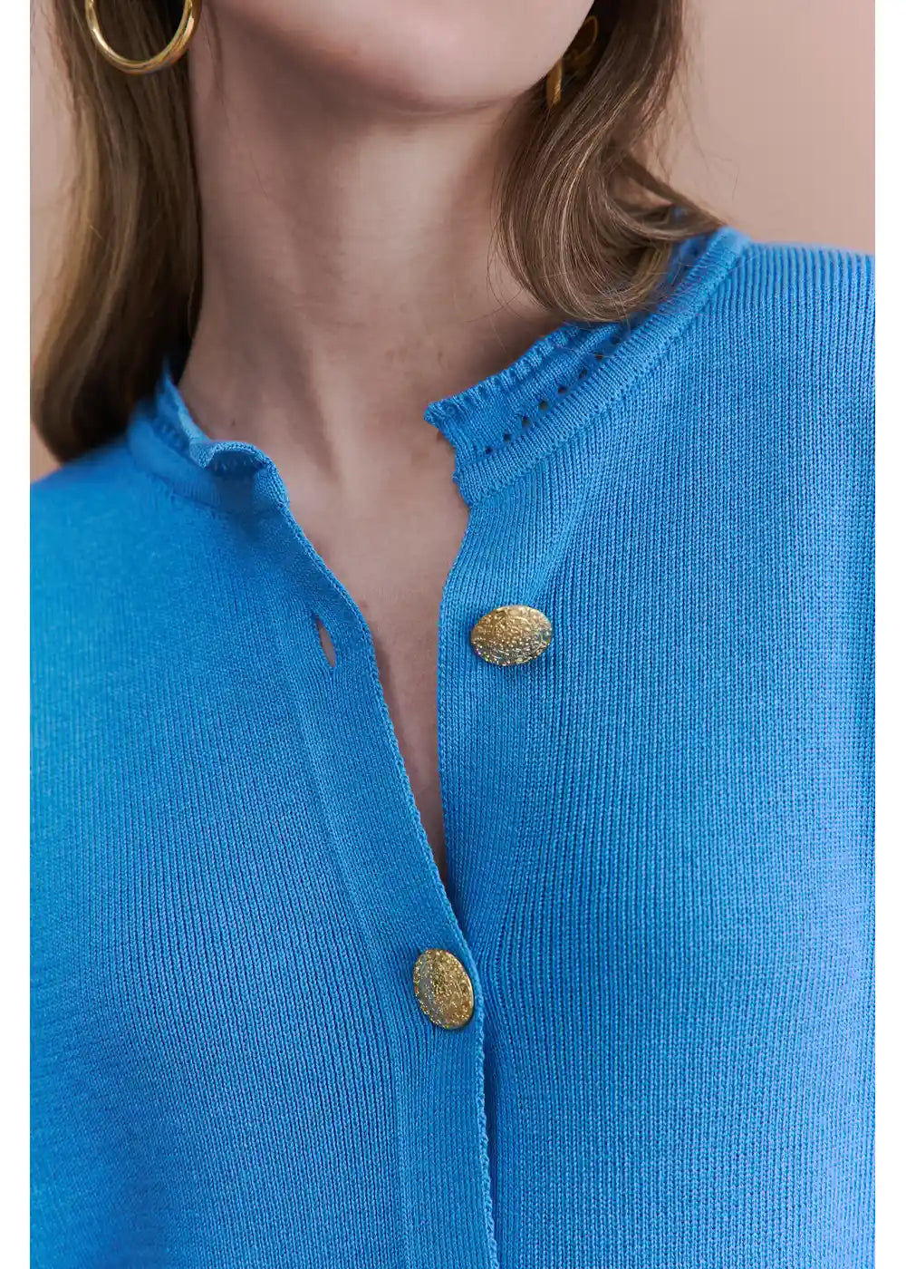 Destaca por su cuello redondo con acabado deshilado sutil y botones dorados frontales que le dan un toque sofisticado.